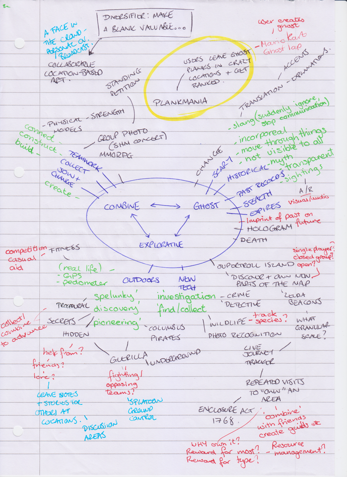 I began with a brainstorm around the central theme as normal, but in order to boost creativity I enlisted the help of my younger sister Hayley (aged 20) to work with me. Once I had finished a round of brainstorming, I then passed the page to her and asked her to respond to the theme herself as well as to my notes. I then responded to her comments, and back and forth it went again. The idea behind this was to harness thoughts outside of my own brain, as well as both of us having our thought process manipulated by each other.