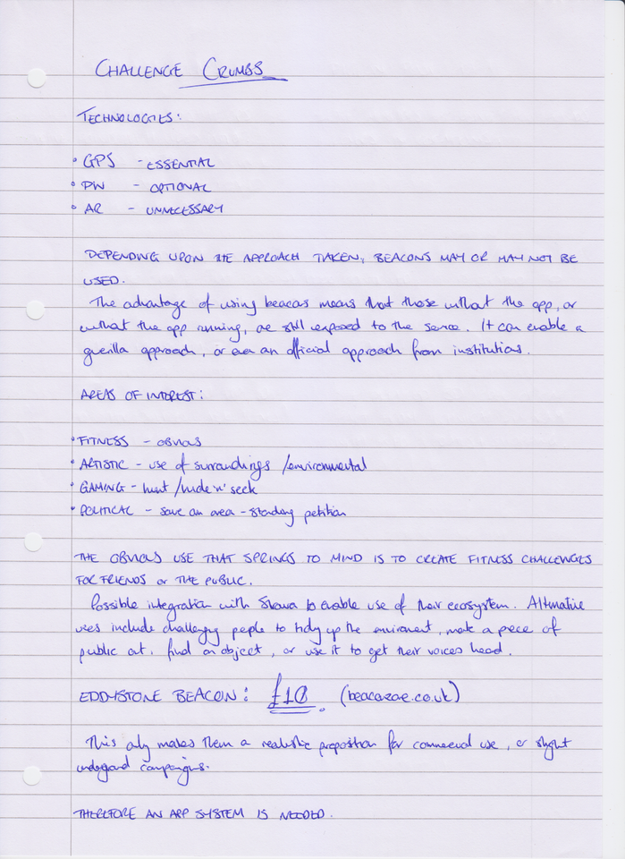 This stage forced me to spend some time researching the chosen technologies - in this case BLE beacons. For some reason I had in my mind that they would be cheap and plentiful like NFC tags—I was however suprised to find that BLE beacons actually retail for £10 upwards. This is a major obstacle for an app that requires them as it forces a significant user investment.