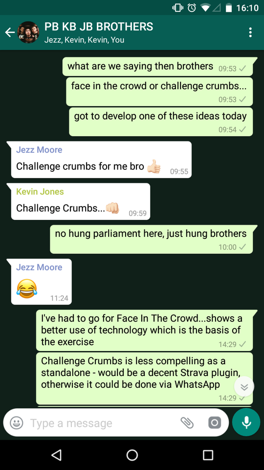 Having generated all these ideas I then had to find one to focus on and develop. Again, to ensure I was as open as possible, I narrowed it down to five ideas and asked a couple of friends not in the tech industry (James Moore an electrician, and Kevin Jones a surveyor) to choose their favourite:
