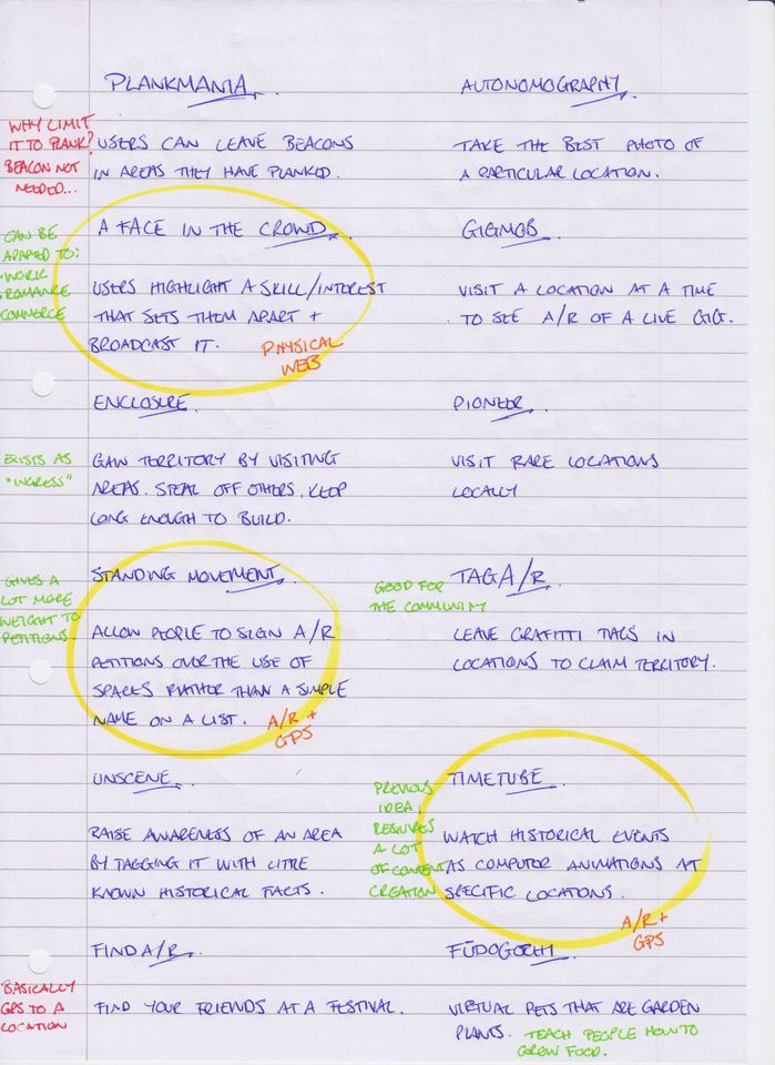 This process was followed up by idea generation. I tried to list as many ideas as I could, and forced myself to keep going until I had reached at least 15 ideas. Here is the list: