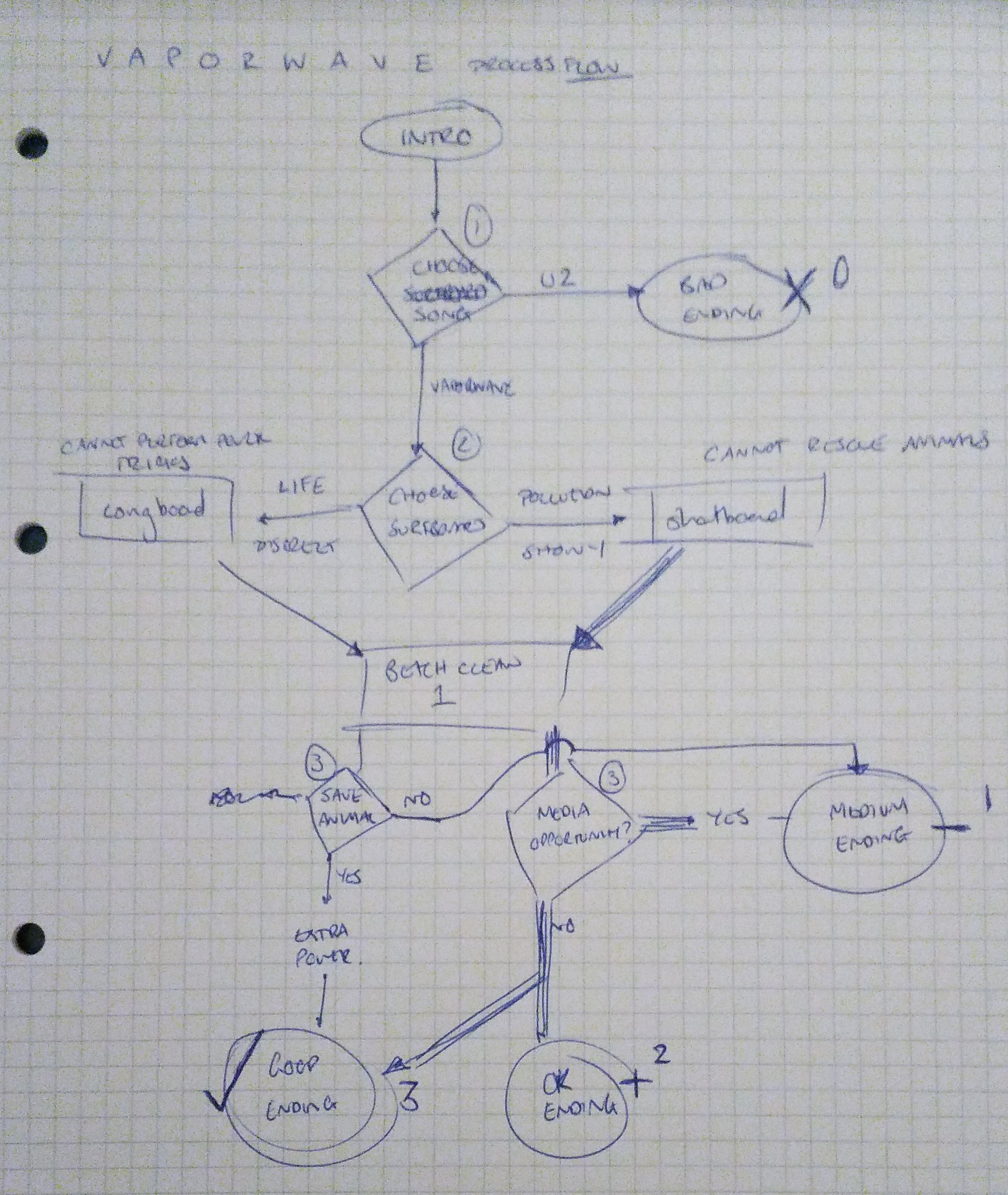 Using my previous game concept as a base, I chose to create a flow diagram to help me understand the necessary choices and content for my novel:
